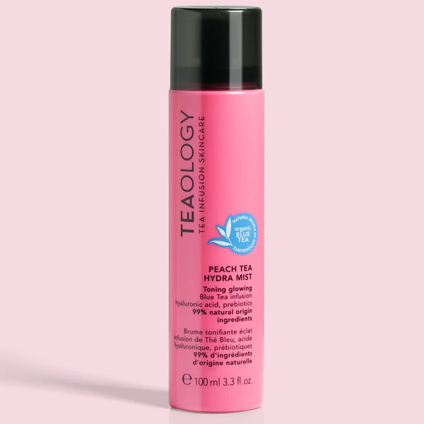 Spray viso idratante con infuso di tè blu, acido ialuronico micro-molecolare e prebiotici.